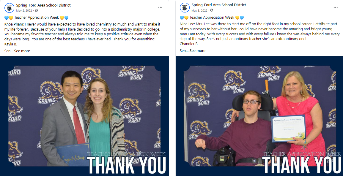 As all school communicators know, finding new purposes for existing content can serve as not only an incredibly handy timesaver, but also as a way to provide additional exposure to audiences beyond its original. So when Erin Crew, director of communications, marketing and media at Spring-Ford Area School District in Pennsylvania was developing plans to collect student testimonials for Teacher Appreciation Week a few years ago, she recalled an archive of appreciation notes authored by graduating seniors from over the years, originally used for a different event, she could tap into.